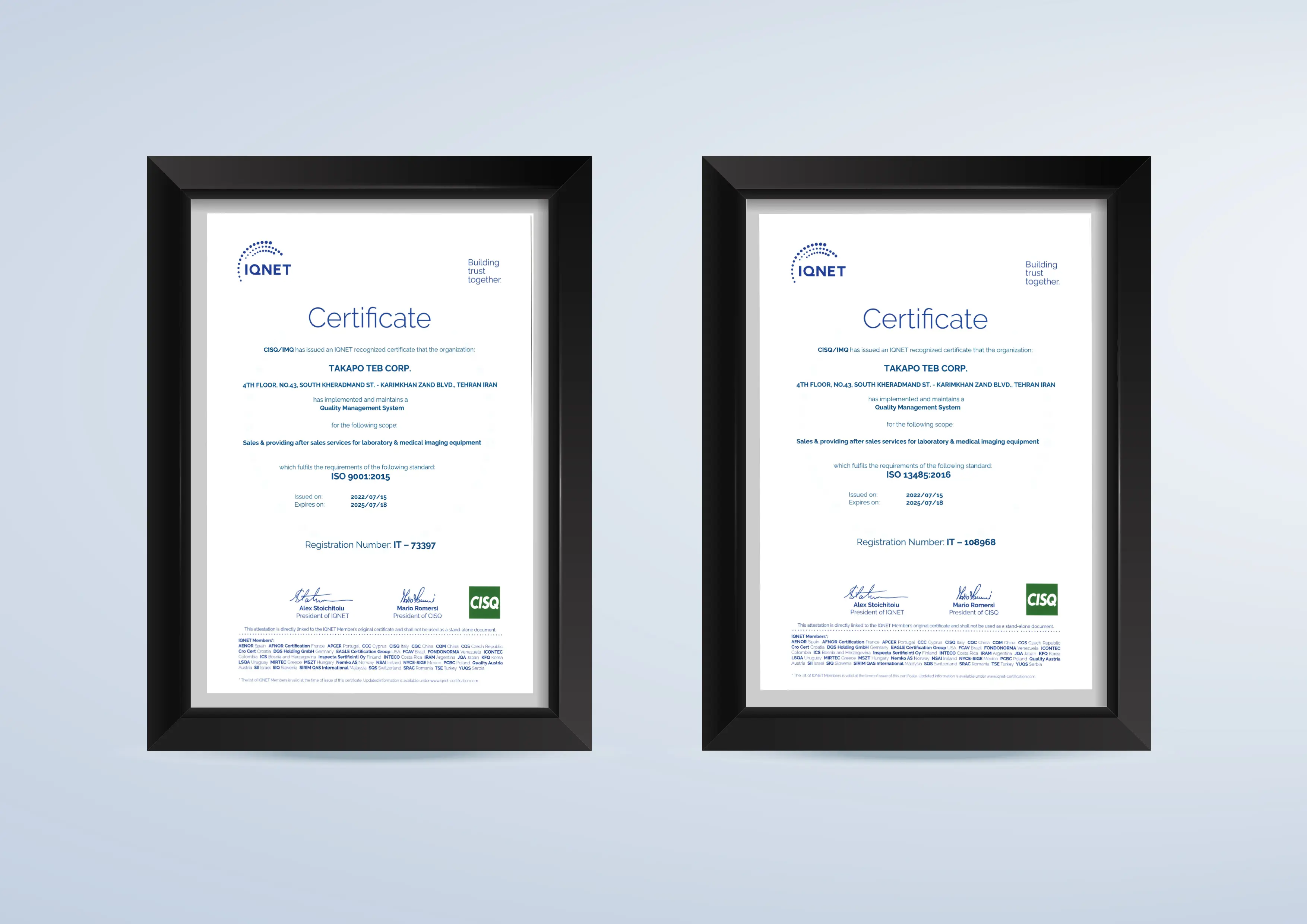 تکاپو طب مفتخر است که نمایندگی انحصاری برترین کمپانیهای بینالمللی را در ایران بر عهده دارد و از جمله اولین شرکتهای ایرانی است که به عضویت شبکه جهانی IQNET درآمده است. همچنین دریافت گواهینامههای معتبر بینالمللی ISO 9001:2015 و ISO 13485:2016 در زمینه مدیریت کیفیت تجهیزات پزشکی، گواهی بر تعهد ما به استانداردهای جهانی است.